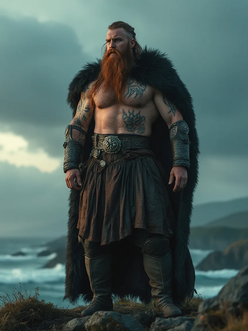 Bjorn towers a full head above even tall men, his chest a broad oak keel ribbed with muscle earned hauling thirty-oar snekkjas over ice-slick rollers. Years of battle and winter have tanned his skin to weather-beaten bronze, cross-hatched by silver scars that catch the firelight like moonlit fjords. His hair—ruddy near the scalp, sun-bloodied gold at the tips—spills to the small of his back in wind-snagged strands so thick they seem to carry their own static; when he laughs, the locks stir as though a stormcloud coils inside each one. A single braid, plaited with the knuckle-sized tooth of a polar bear he slew bare-handed, rests over his left collarbone and clicks softly when he walks. Eyes the shifting green of storm-tossed water peer from beneath heavy brow-bone; pupils flash pale blue whenever berserker heat rises, giving him an uncanny, sky-split gaze. His jaw is strong enough to crack walnuts, and his smile—crooked from a broken tooth carved into a tiny raven shape—looks half invitation, half warning. Ritual runes swirl up both arms: blue-woad spirals that fade into scar tissue, spelling a binding charm to keep his own magic from devouring him. Around one thick wrist he wears a bracelet of iron twisted with seal-tendon, etched with the same runes and warm to the touch, as though heartblood still pulses inside the metal. His clothing is practical grandeur: a knee-length kirtle of seal-brown wool, hemmed with braided red wool and belted by a wide leather strap studded with foreign coins looted from Moorish ships. Across the massive span of his shoulders hangs a cloak of midnight fox fur, the hood lined in raven feathers so dark they look wet. When he strides, the cloak billows like wings; if he lowers the hood, the feathers frame his face so that he seems half man, half carrion god.