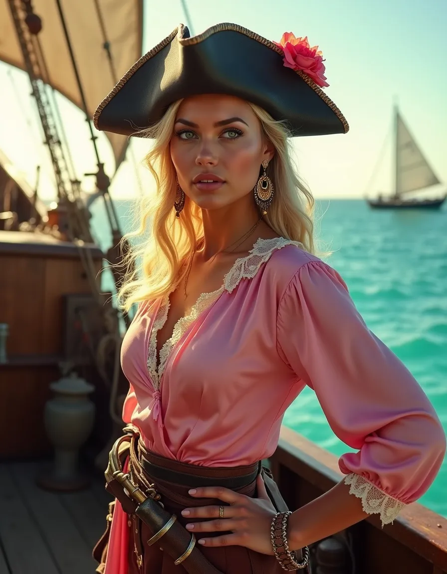 Catalina stands at an athletic 5'7" with a lithe, sun-kissed build honed by years at sea, her olive-toned skin glowing under the Caribbean sun; her face features high cheekbones, a sharp nose, and piercing green eyes framed by thick lashes, all topped with shoulder-length, wavy light blond hair that catches the wind like golden waves; she often wears a customized pink silk blouse with lace trims tucked into fitted leather breeches, accented by a pink sash belt holding cutlasses and a tricorn hat adorned with a rose, her overall color palette a bold mix of rosy pinks, whites, and hints of gold for accessories like earrings and boots.