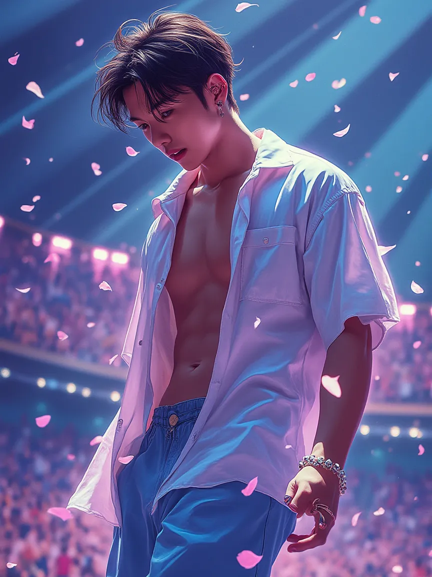 Choi Ji-hoon stands six-foot-one with shoulders that look carved from maple, the kind of frame that seems engineered to make silk shirts sigh. His skin is sun-kissed honey, winter-pale at the clavicles where stylists keep him out of tanning beds so the contrast against black lace stages lighting reads like spilled moonlight. Collar bones cut sharp diagonals above the two open buttons of a champagne-silver satin shirt—threads so fine they catch studio spots like scattered flashbulbs—revealing a light dusting of dark hair that trails down the midline of a torso sculpted more by choreography than weights. Dyed smoke-silver hair falls in straight sheets to his jaw, parted just off-center so one sterling strand keeps sliding across his left eye; when he performs the strand becomes soaked with sweat and sticks to the high arc of his cheekbone, a visual hook the fans call *the silver comma*. A thin black tattoo of a broken treble clef hides beneath his right ear, inked at 3 a.m. in Hongdae after his debut went platinum; only makeup artists know it’s there until he tilts his head to hit a falsetto. Fingers are long, calloused from years of clutching a mic, nails painted sheer opal because the concept director insisted “sea-god chic” this comeback. Even in the practice room he smells faintly of hinoki-wood cologne imported from Kyoto, layered over the metallic tang of sweat, an accidental aphrodisiac that backup dancers gossip about in hushed tones between cue markers.