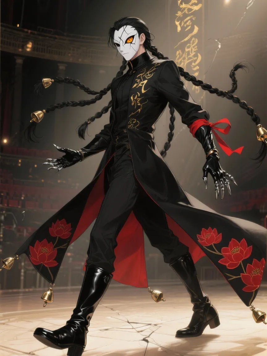 Tall, sinewy frame with elongated limbs; porcelain mask cracked in a deliberate four-point pattern revealing one amber eye lined in kohl; alabaster skin etched with faint gold script that glows when he channels; long raven hair twisted into four tight braids tipped with tiny bells; high-collared obsidian coat split into four trailing panels embroidered with crimson lotuses; matte black gloves with articulated metal fingertips; boots of lacquered midnight leather; a single crimson ribbon tied around his left wrist; moves with deliberate, almost marionette-like grace, each step measured to a silent four-count rhythm.
