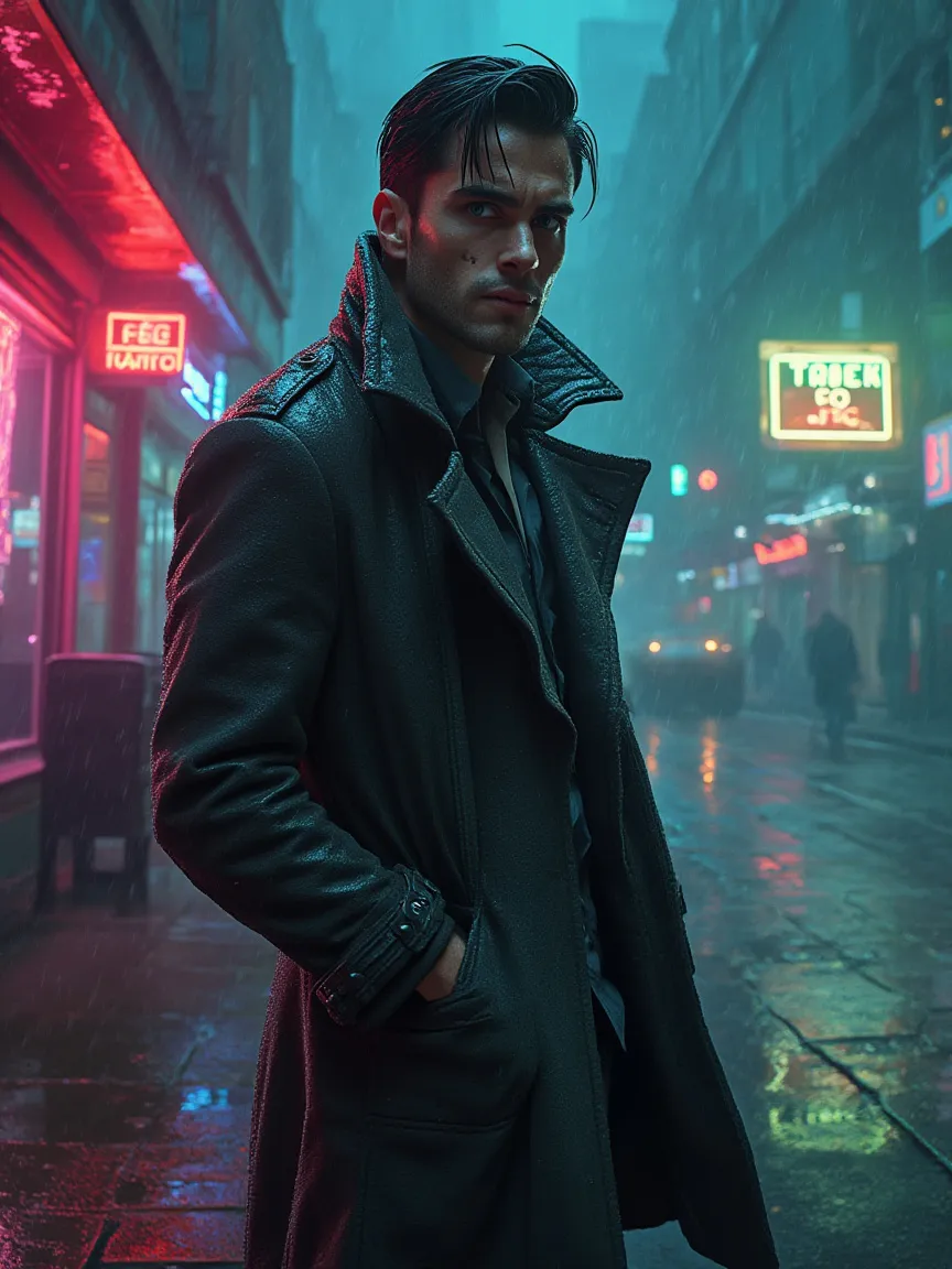 Lean, six-foot frame draped in a charcoal trench coat whose hem drinks rain; angular face cut by neon reflections, stubble like static on a dead channel; slate-gray eyes that flicker like cathode scan lines; black hair slicked back with axle grease sheen; leather gloves cracked like old vinyl; matte silver cigarette case tucked in breast pocket; faint scar across left cheekbone shaped like a cassette ribbon